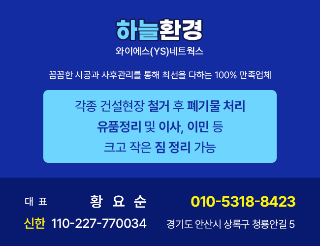 생활 속에서 발생하는 각종 폐기물과 정리·처분이 어려운 물건들을 신속하고 깔끔하게 처리해드립니다.